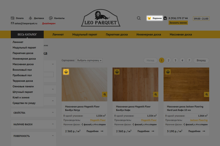 На сайте интернет-магазина напольных покрытий предусмотрена возможность перехода в корзину прямо из шапки или непосредственно из перечня товаров в разделе