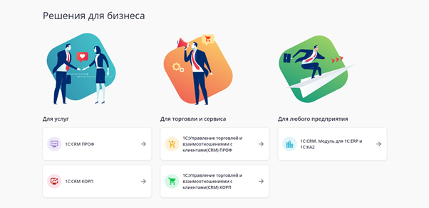 1С разработал несколько CRM-систем: для услуг, торговли и сервиса, а также универсальную для любых предприятий. Сервис позволяет упростить и автоматизировать бизнес-процессы, подключить сквозную аналитику, и предоставляет различные пулы возможностей для руководителей, менеджеров по продажам и маркетологов.