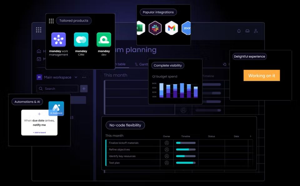 Monday.com — универсальная платформа для проджект-менеджмента, идеально подходящая средним и крупным командам. Она позволяет гибко настраивать рабочие процессы, строить дашборды и работать с аналитикой. Среди уникальных функций — автоматизация процессов, настройка KPI, интеграция с CRM и аналитические инструменты. Monday.com особенно полезен для разработок, где требуется настраиваемая визуализация и регулярная отчетность. Стоимость начинается от $9 в месяц на одного пользователя, что делает его доступным вариантом для компаний специалистов среднего размера и выше.