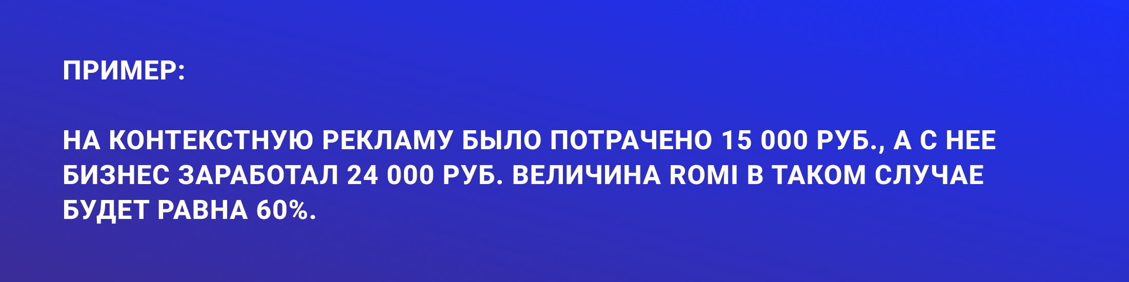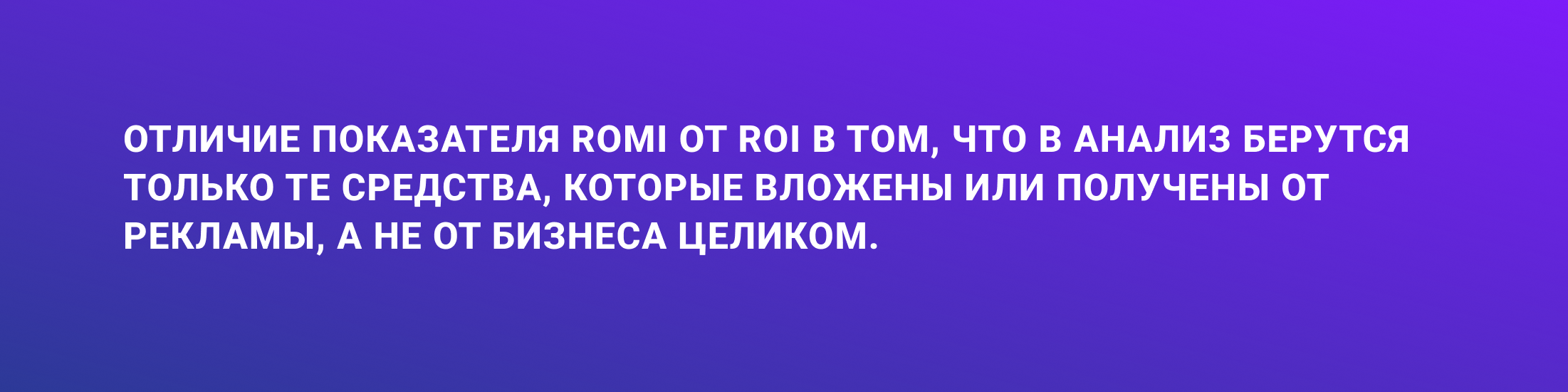 ROMI (Return of Marketing Investment), или коэффициент возврата инвестиций в маркетинг — метрика, созданная на основе ROI и более подходящая для анализа эффективности контекстной рекламы (по сравнению с ROI).
