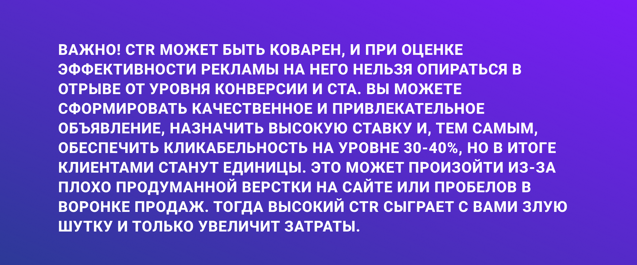 CTR (Click-through Rate), или коэффициент кликабельности показывает процентное соотношение количества кликов к количеству показов. Эта метрика дает понимание визуальной привлекательности контекстной рекламы: низкий показатель означает, что пользователи заинтересованы недостаточно для того, чтобы узнать суть рекламируемого продукта или перейти на страницу покупки.
