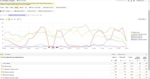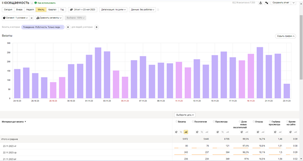 Анализ динамики показателей за промежуток времени. Удобно будет представить изменение показателей в виде диаграммы и задать определенный период, чтобы наглядно оценить динамику. Если внутри временного периода диаграмма разделена на мелкие промежутки, то легко будет сопоставить увеличение или уменьшение определенной метрики в связи с каким-либо событием (запуском новой рекламы, появление аналога у конкурента и т.д.).