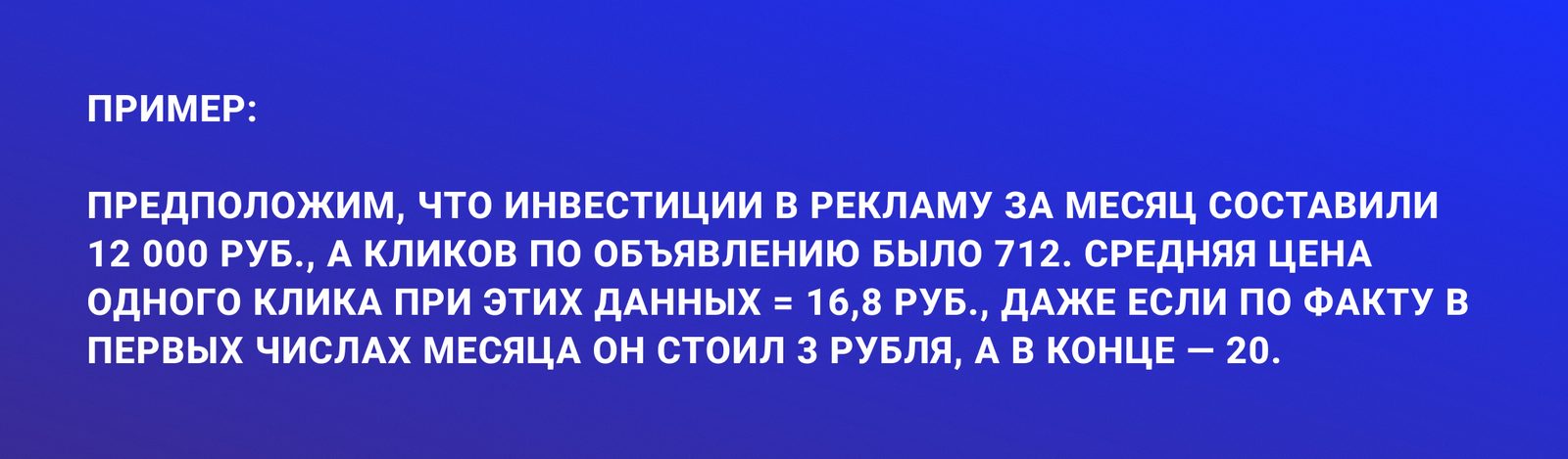 Даже если стоимость клика в начале месяца была в два раза меньше, чем в конце, CPC покажет среднее число по всему месяцу или другому периоду, который вы выберете в Яндекс.Директе.