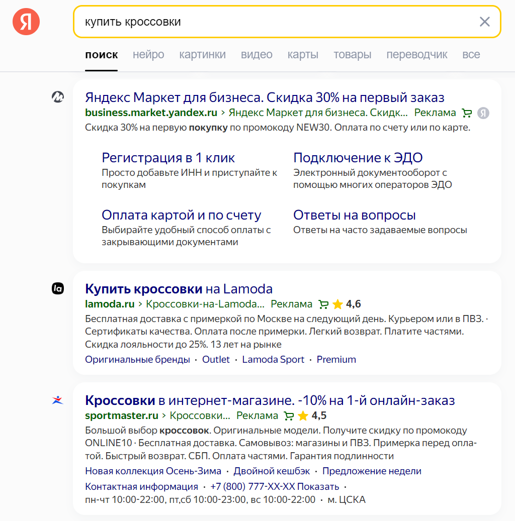 Вы создаете объявления, которые будут показываться по выбранным ключевым словам. Например, если вы продаете обувь, ваше объявление может отображаться, когда пользователь вводит запрос «купить кроссовки».