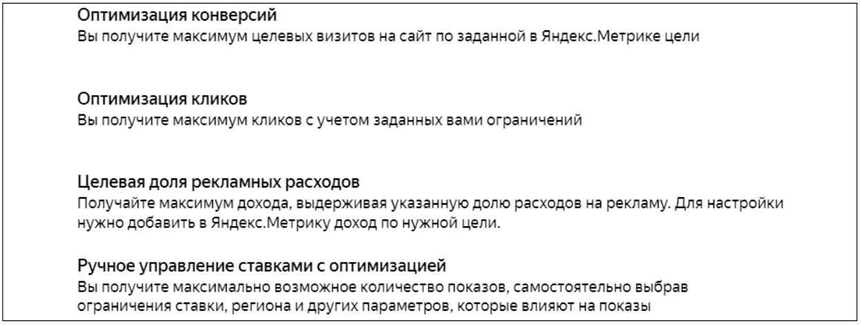 Автоматические стратегии: система самостоятельно регулирует ставки на основе заданных целей. В Яндекс Директ доступны следующие автоматизированные подходы: