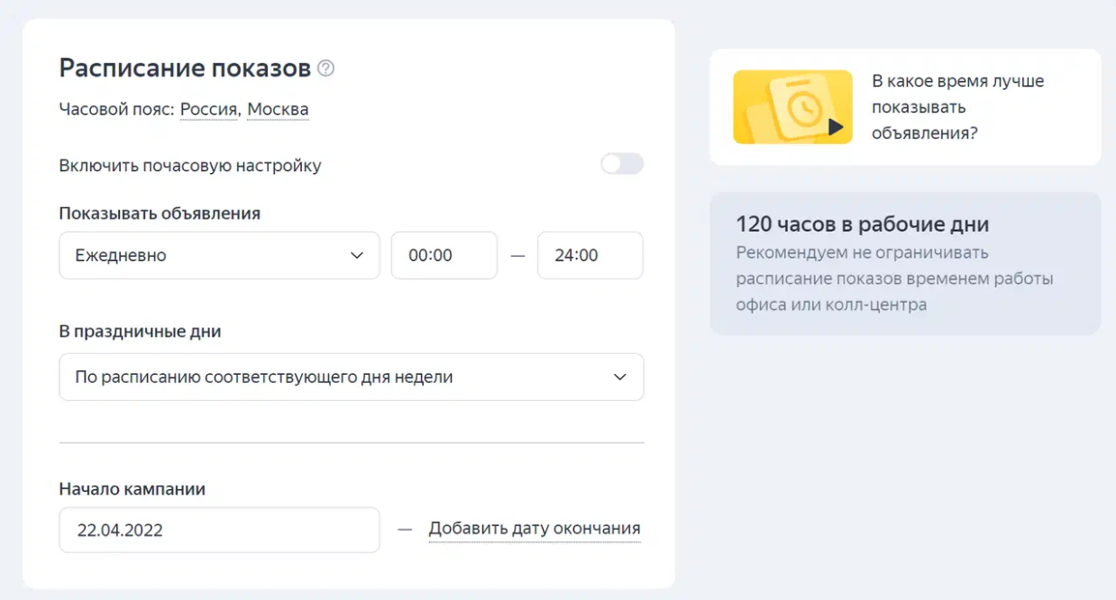 Не всегда нужно показывать рекламу 24/7. Проанализируйте, когда ваша целевая аудитория наиболее активна, и настраивайте показы именно в это время. Например, если вы рекламируете B2B-услуги, разумно будет ограничить показы рабочими часами будних дней.