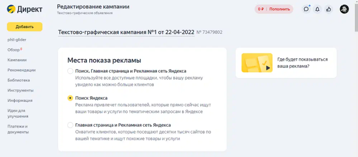 В Яндекс Директ есть несколько типов кампаний. Например, поисковая реклама направлена на тех, кто активно ищет товар или услугу. Реклама в РСЯ же лучше работает для формирования интереса или напоминания о товаре. Можно выбрать один из трех вариантов: