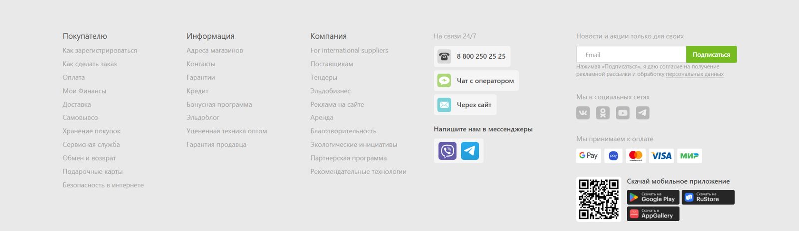 Эльдорадо добавил в футер форму подписки на email-рассылку и ссылки на актуальные акции, что повысит шансы на совершение покупки.