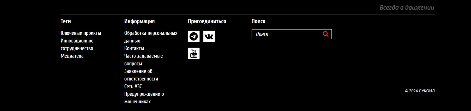 Футер оформляется в фирменных цветах и с элементами стиля бренда, чтобы поддерживать общий визуальный образ сайта и усиливать узнаваемость. Это помогает пользователям сразу идентифицировать компанию и формирует единое впечатление от сайта.