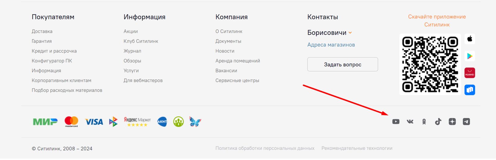 Социальные сети — это мощный инструмент взаимодействия с аудиторией за пределами сайта. Иконки с активными ссылками на страницы и каналы компании в Одноклассниках, ВК, YouTube, Telegram помогают пользователям продолжить взаимодействие с брендом и следить за его новостями.