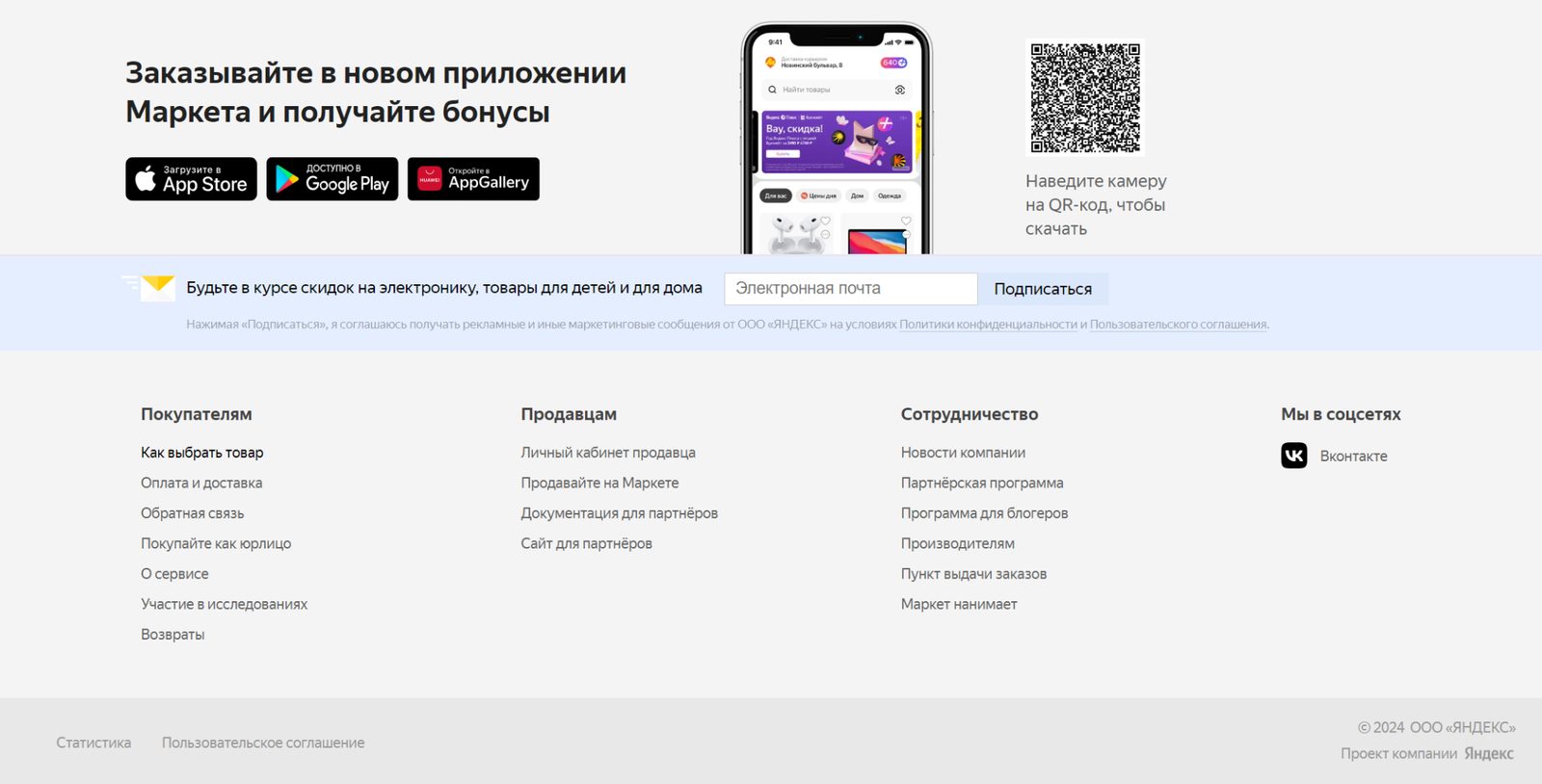 Не стоит перегружать подвал излишней информацией, особенно если она не имеет прямого отношения к основным целям пользователя. Примером минимализма может служить сайт Яндекс Маркета, который использует простые, лаконичные элементы в подвале, чтобы не отвлекать внимание от ключевой информации.
