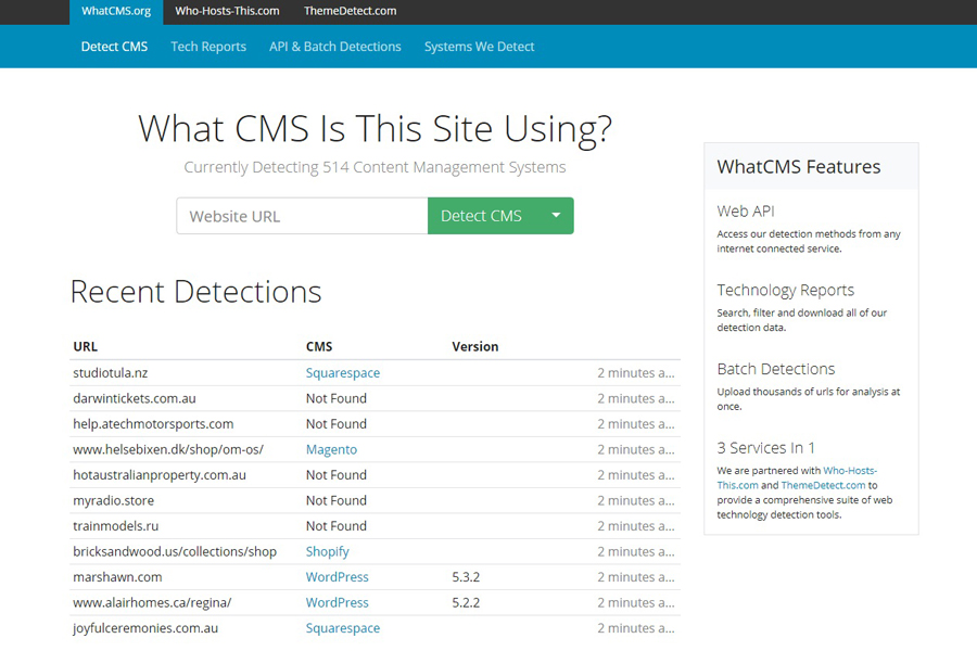 Воспользовавшись им, помимо CMS сайта Вы можете узнать о том, какие фреймворки и языки программирования были использованы для его создания, а также провайдера хостинга. Сервис не проводит пакетную проверку и не имеет русскоязычного варианта, что является его недостатками.