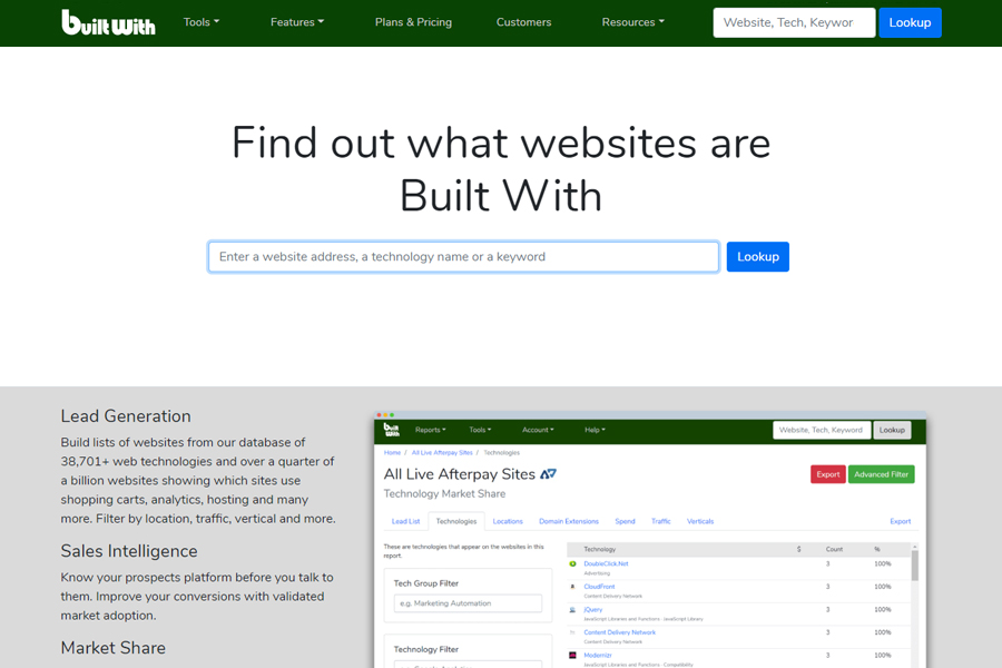 Помимо определения CMS управления сайтом, “Built With” позволит выяснить и ряд других технологий, которые применяются на нём. Ещё бы: ведь база данных представлена более чем 38 500 технологий и четвертью миллиарда сайтов! Разработчики предусмотрели возможность использования фильтров по месту расположения, посещаемости и т. д., а также целый ряд фишек, позволяющих получить необходимые данные.