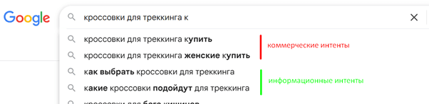 Если видите статьи, подборки, длинные тексты — это информационный интент. Если выдача состоит из товарных страниц, прайсов, лендингов — коммерческий.