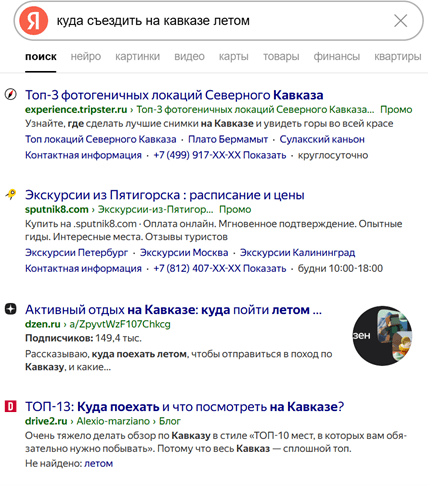 В первом случае видно, что топ состоит из предложений для тех людей,уже решивших, что хотят приобрести готовый тур. Во втором же — статьи для туристов, которые, скорее всего, решили составить маршрут полностью самостоятельно.