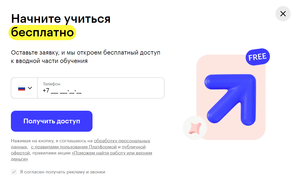 Skillbox показывает всплывающую форму регистрации с приятным предложением взамен на контакты.