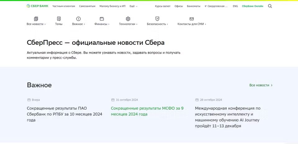 Оформление новостей на сайте Сбера выполнено с участием как холодных, так и теплых цветов, и все они — цвета бренда.
