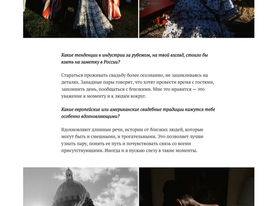 Сравните с этим примером. Тоже есть акценты жирным шрифтом, но их значительно меньше. В статье в формате интервью выделены только вопросы, остальной текст стилизован стандартно обычному тексту блога. Абзацы более собранные, а расстояние между ними — большое. Читать такой материал проще и приятнее.
