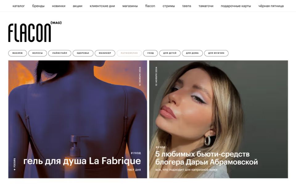 Основной цвет бьюти-блога на сайте Золотого Яблока — белый. Остальные акценты достигаются за счет изображений приглушенных оттенков и бежевой подсветки кнопок.