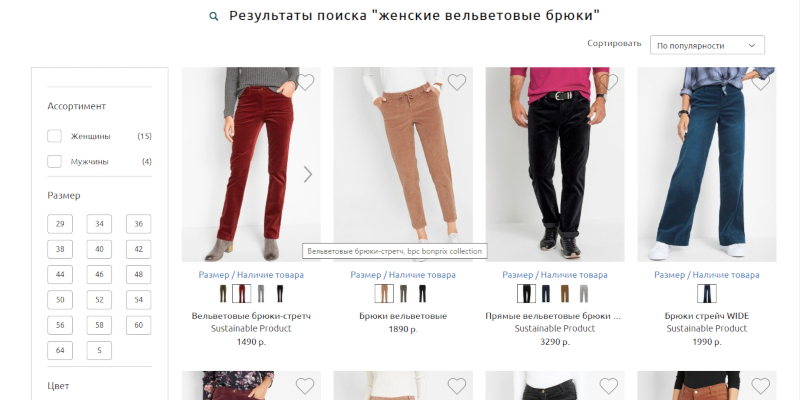 Для тех, кто ищет не определённую модель, а тип товара, могут потребоваться фильтры. Благодаря им пользователи смогут самостоятельно сузить выдачу, отсортировав то, что им не интересно. Возможность сортировки по стоимости, бренду, предназначению и целому ряду других параметров (в зависимости от продукта) правильно предлагать после того, как пользователь выбрал нужную ему категорию. В противном случае велик риск того, что на первых строчках выдачи окажутся нерелевантные товары. Например, если пользователь ищет смартфон, но не выбрал соответствующую категорию, зато отсортировал товары по цене, начиная с дешёвых, то в выдаче он получит не смартфоны, а дешёвые аксессуары к ним.