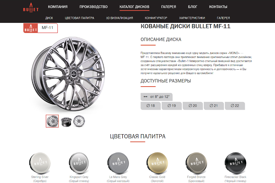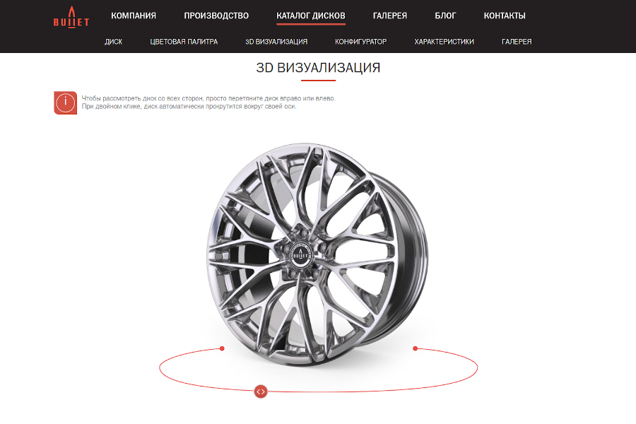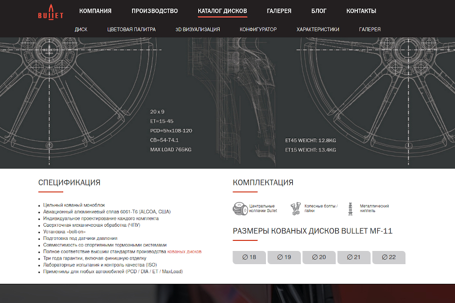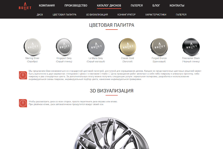 В интернет-магазине для компании, производящей и продающей эксклюзивные кованые диски, мы реализовали целый ряд интересных решений. Вот так выглядит карточка диска: