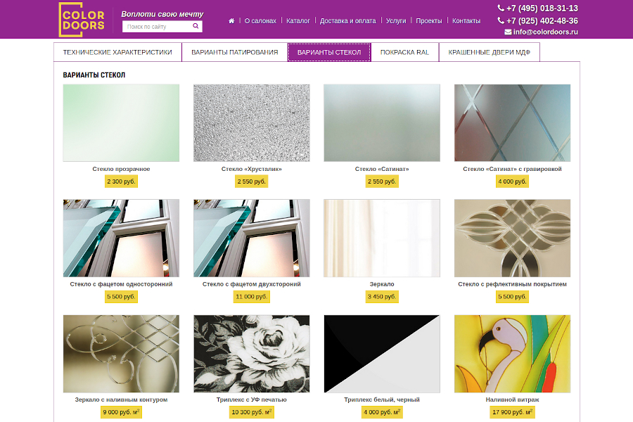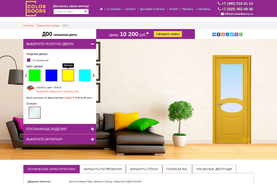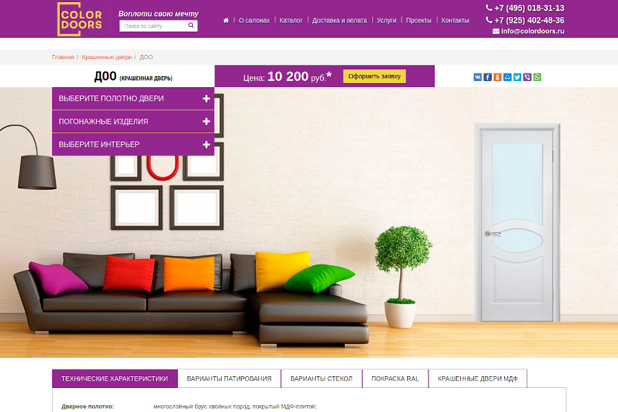 Разрабатывая сайт для магазина дверей, мы решили сделать карточки более функциональными и расширенными, добавив к ним не только технические характеристики, но и целый ряд других решений. Среди них имеется возможность посмотреть на то, как они будут выглядеть в интерьере. Последнее особенно важно, поскольку покупатель получает представление о внешнем виде интересующей его двери ещё до её установки у себя.