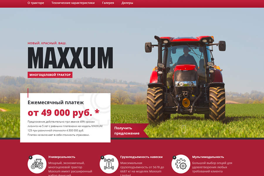 Продажа классического продукта или целого их комплекса в сфере “B2B”. Как правило, landing page заточена под один конкретный товар или предложение, но можно выделить ряд ситуаций когда продаётся и сам бренд. Ниже можно увидеть реализацию на примере промо-страницы трактора “Magnum” марки “Case IH”;
