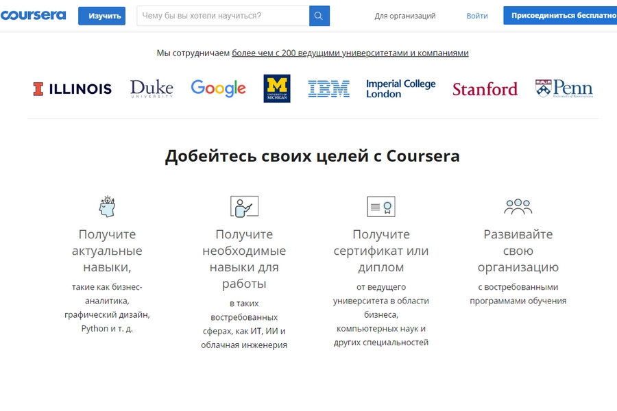 Главное направление проекта “Coursera” – массовое образование в режиме “online”. В его рамках осуществляется публикация бесплатных онлайн-курсов для всех желающих расширить свой кругозор и получить необходимые знания и навыки в той или иной сфере. Его основали профессоры, которые преподают информатику в Университете имени Леланда Стэнфорда-младшего (Стэнфорд, Калифорния, США).