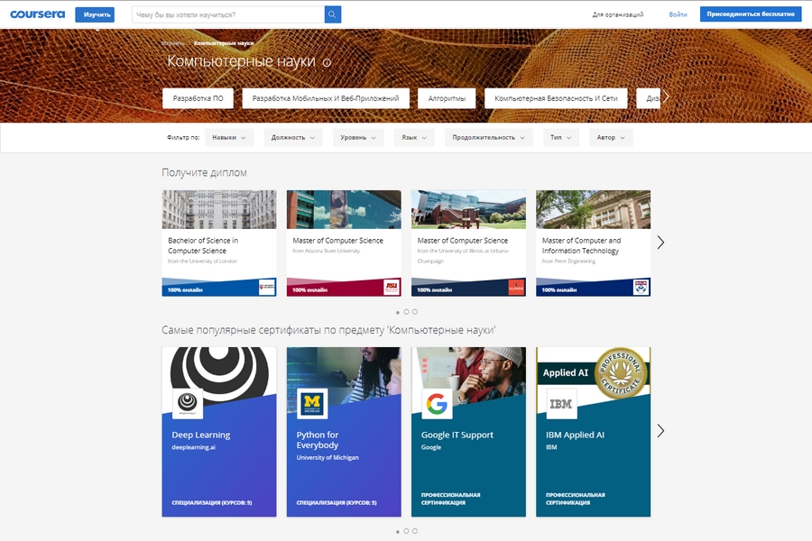 Официальный сайт “Coursera” порадует удобством использования. Несмотря на то, что перечень его курсов очень широк, найти желаемый не составит проблемы. Достаточно перейти в нужную тему – и перед Вами появится всё необходимое: направления, доступные для выбора, а также фильтры поиска по разным параметрам. Самих курсов очень много: они охватывают целый ряд сфер и направлений. К примеру, в разделе, посвящённом компьютерным наукам, имеется сразу несколько направлений: