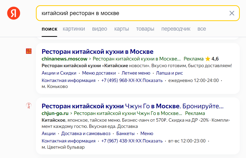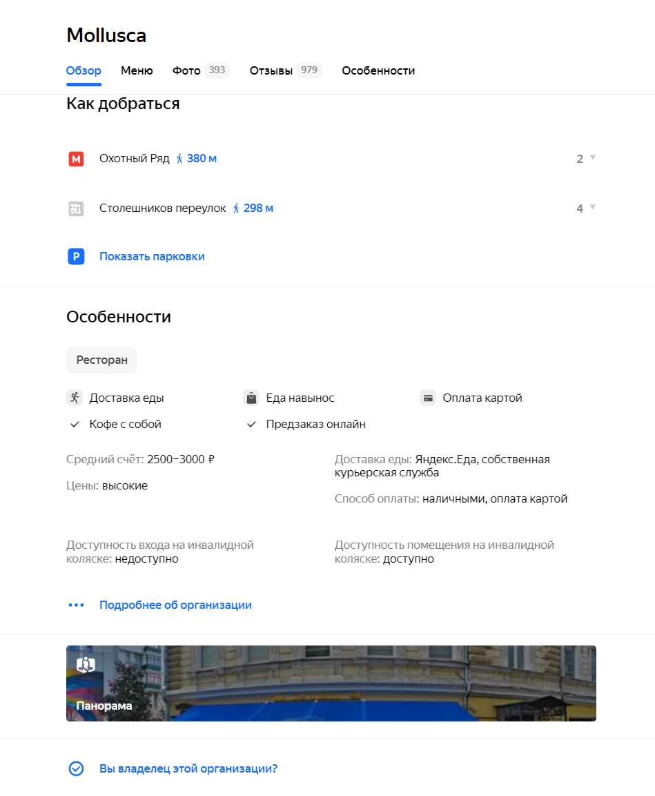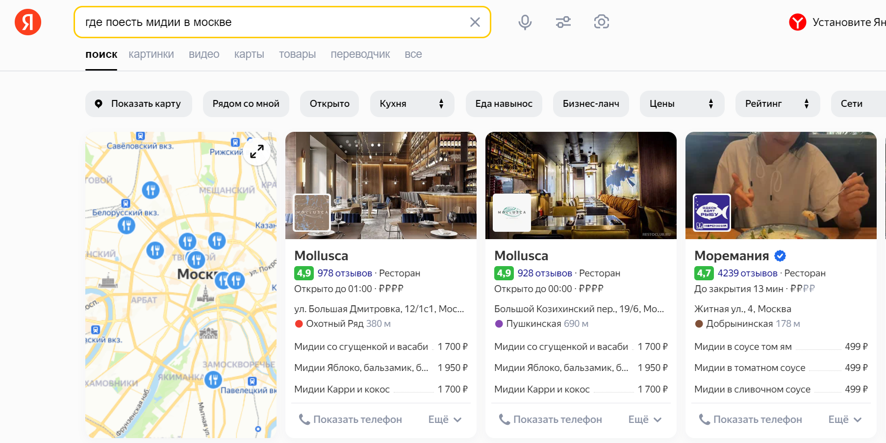 В сниппете ресторанов есть телефон, адрес, время работы и основные пункты структуры сайта