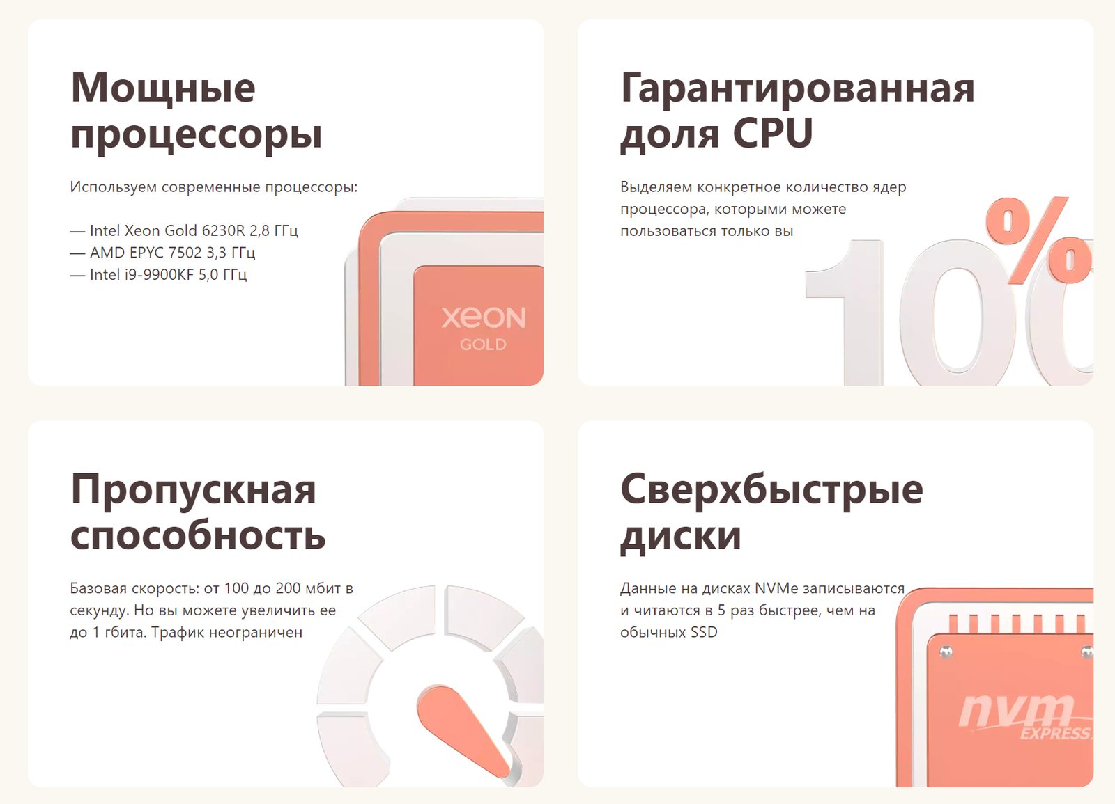 - Производительность отличная — за что спасибо современным серверам и объемным SSD-хранилищам.