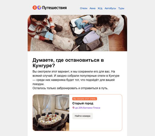 Письма, которые «догоняют» человека, покинувшего портал — верный способ дать ему повод подумать еще раз и вернуться на сайт. Источник: https://travel.yandex.ru/