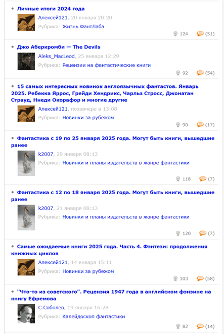 Портал для любителей фантастики, где участники оценивают книги, обсуждают новинки жанра и участвуют в формировании рейтингов. Несмотря на нишевую тематику, сообщество сайта характеризуется активными обсуждениями и высокой вовлеченностью своих читателей. Источник: https://fantlab.ru/
