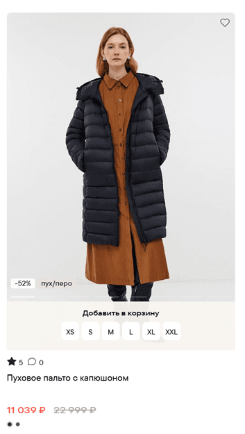 Всплывающая CTA-кнопка с возможностью выбора размера прямо из каталога. Источник: https://baon.ru/womenwear/