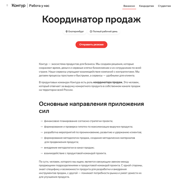 Рассмотрим пример оффера на вакансию, опубликованного СКБ Контур. По ходу чтения человек, заинтересованный вакансией, знакомится с родом деятельности компании, ее миссией, описанием непосредственно вакансии.