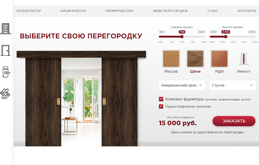 Пользователь имеет возможность выбрать необходимую высоту и ширину дверного проёма, материал для изготовления перегородки, а также её цвет. Помимо этого, ему доступен выбор вида заполнения для дверного полотна. При выборе тех или иных элементов внизу отображается итоговая стоимость перегородки, а также имеется возможность перейти в форму заказа.