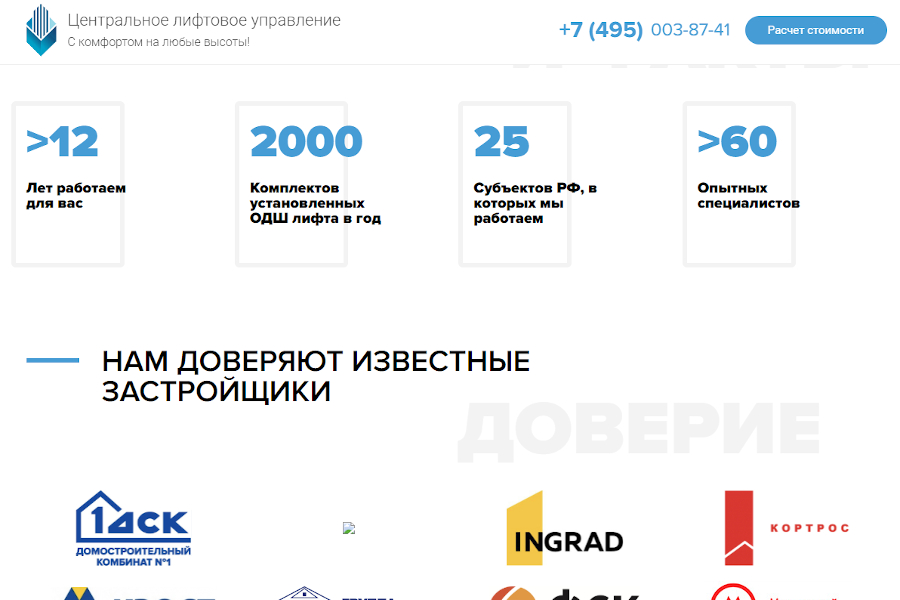 Нижеприведённое решение не является новым, однако хорошо работает, а потому мы его и используем. Заказчикам нужны не расплывчатые фразы о многолетнем опыте работы или сотрудничестве с целым рядом компаний. Им нужны конкретные цифры и примеры, говорящие лучше любых слов. Именно такое решение мы использовали при создании лендинг-пейдж для компании «ЩЛЗ», которая занимается обрамлением лифтовых порталов.