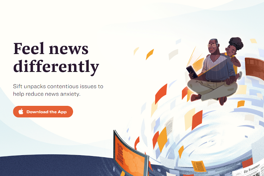 Ещё одним примером может послужить сайт компании “Sift” с анимированными авторскими иллюстрациями, в полной мере отображающими атмосферу предлагаемого продукта. Это – необычный сервис, модифицирующий новостной контент для снижения стресса у читателей.