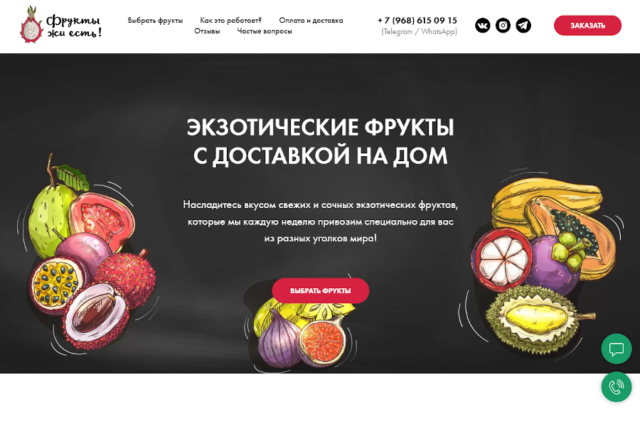 Авторские иллюстрации уникальны, а потому способны выделить любой шаблонный landing и перевести его на другой уровень. Конечно же, важно, чтобы они были, что называется, в тему и по теме и соответствовали ожиданиям целевой аудитории. В качестве примера идеально подойдёт вот этот сайт компании, доставляющей экзотические фрукты на дом, с его ярким рисованным баннером.