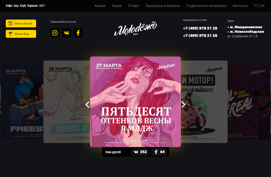 Конечно же, использованием слайдера никого не удивишь, а вот его необычной реализацией – можно. Для посадочной страницы бара «Молодёжь» мы выбрали решение в виде карусели с необычным выдвижением слайдов.