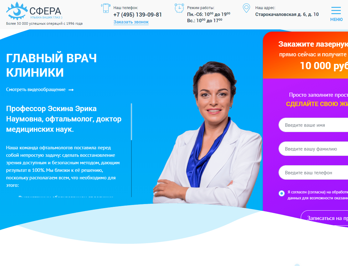 Что может быть хуже скучного вечера, который никак не закончится? Спросите в “Serptop” – и мы Вам ответим: безликий landing! Разрабатывая решение для офтальмологической клиники «Сфера», мы понимали, что оно должно быть ярким и запоминающимся. Кто мог представить своё детище лучше, чем его основатель – главный врач, профессор, доктор медицинских наук?