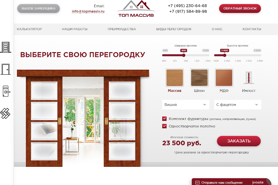 Разрабатывая лендинг «под ключ» для компании «ТОП Массив», мы предложили не совсем обычную форму заявки. Она объединена с калькулятором, который позволяет заказчику увидеть ориентировочную стоимость заказываемой перегородки, а также с конструктором, который позволяет выбрать целый ряд параметров: от высоты и ширины дверного проёма до материала и цвета изделия, а также вида стекла.