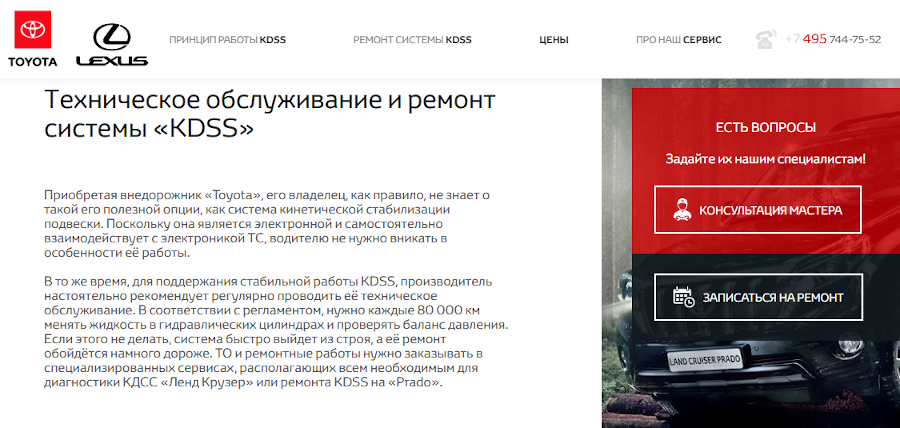 Мы решили создать не два раздельных лендинга по ремонту KDSS “Toyota” и “Lexus”, а один-единый, использовав разные цветовые гаммы для оформления и уникальный текстовый контент для подробного описания той или иной услуги. Для каждой из марок авто есть свой прайс-лист с ценами на услуги, указаны модели, оборудованные KDSS, а также предусмотрена удобная форма для записи на диагностику, в которой владельцу предлагается указать модель его авто.