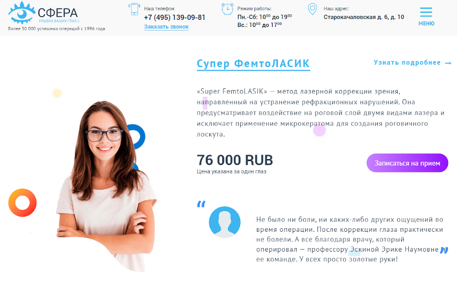 Разрабатывая одностраничник для офтальмологической клиники «Сфера», мы решили, что пациенты желали бы узнать не только о методах лазерной коррекции зрения, но и о впечатлениях тех, кто уже прошёл лечение по тому или иному из них. Для этого были созданы разделы с реальными отзывами пациентов.