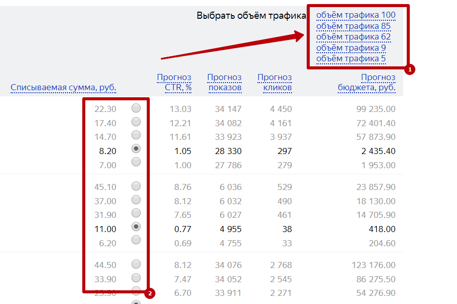 Теперь переходим к выбору оптимальных настроек. Нужно обозначить объем трафика, но при этом сохранить подходящую нам стоимость перехода. То есть подбираем такой объем, при котором списываемая сумма не перевалит за наш предел.