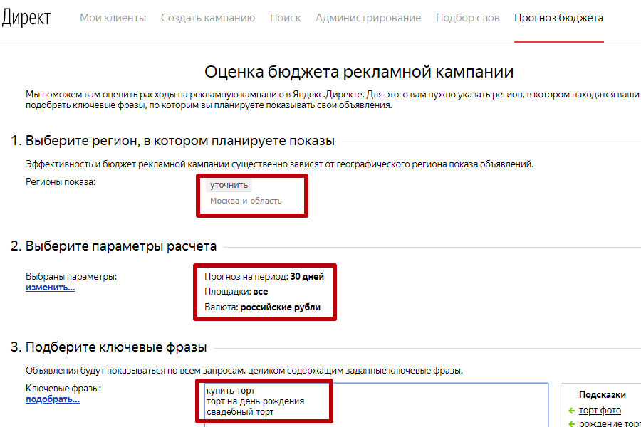 Вернемся к цене клика. Яндекс Директ может самостоятельно прогнозировать стоимость перехода по запросам и составлять предварительные размеры бюджета. Нужно перейти во вкладку «Прогноз бюджета» и заполнить предлагаемые поля.