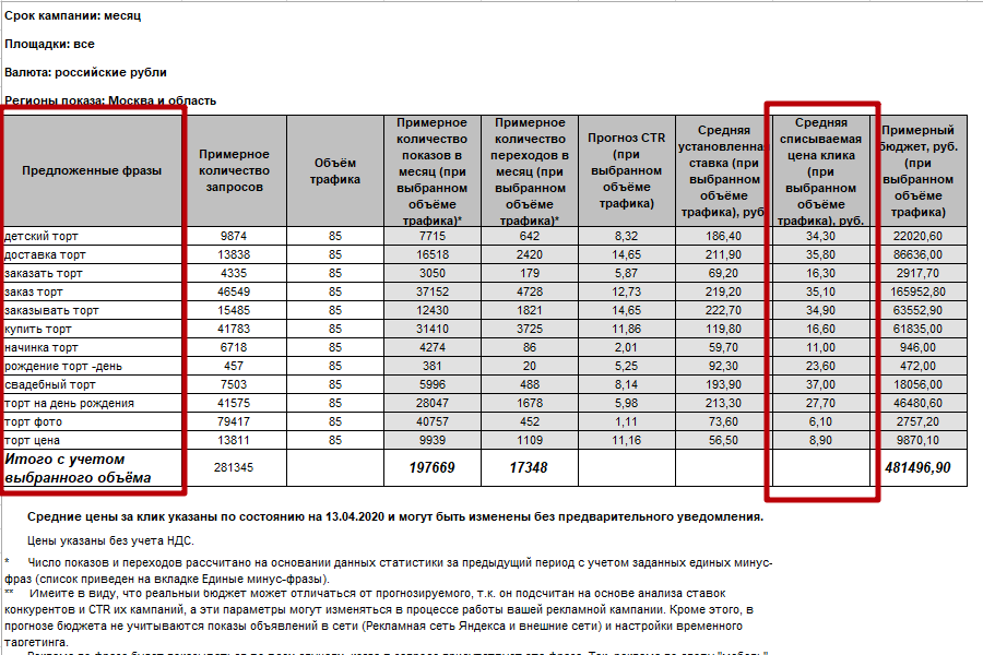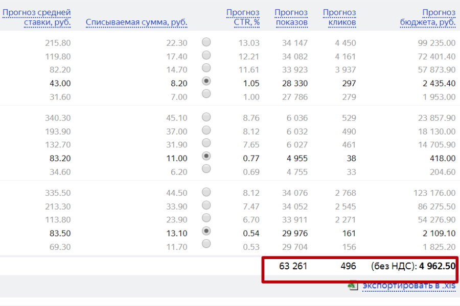 Когда Яндекс Директ посчитал все необходимые нам цифры, нужно выгрузить таблицу с ними для дальнейшей работы. На основе полученных цифр вы уже можете выбрать более дешевые запросы для экономии бюджета. Если стоимость вас устаревает, то оставьте список нетронутым.