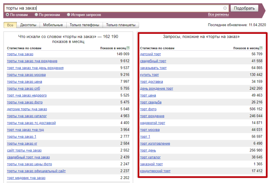 Результаты поиска по запросам будут показаны в левой колонке вордстата. Чтобы подобрать больше подходящих ключей, используйте уточнения, синонимы и разные словоформы. Например, «торты на заказ в москве» или «заказать торт». В поиске похожих запросов вам может помочь правая колонка сервиса.