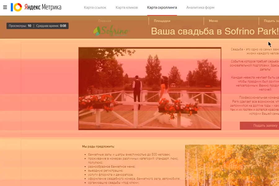 Чем ближе к красному цвет градиента, тем более интересной им является именно эта часть страницы. Как правило, максимальная активность приходится на её верх и центр, а вот её низ привлекает их меньше, и для текстового контента это – звоночек. После этого можно оценить следующее: