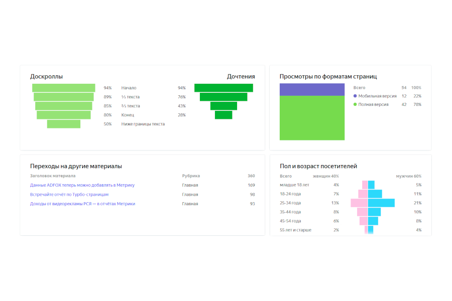 Данный параметр призван оценить число посетителей, которые прочли тот или иной текст, и уровень вовлечённости в него по сравнению с другими. Его можно просчитать для разных категорий аудитории, в частности можно определить: